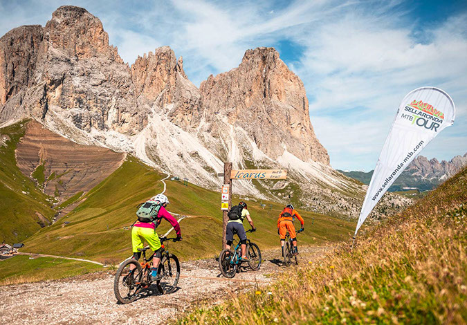 Sellaronda MTB, è un tour panoramico in mountain bike che ci permetterà di attraversare quattro valli attorno al Massiccio del Sella: la Val Gardena, l’Alta Badia, la Valle di Fodom, e la Val di Fassa. Un tour che si può percorrere sia in senso orario che antiorario, utilizzando gli impianti di risalita per godersi il paesaggio e poterlo fare in giornata, per compiere il giro totale ci vogliono dalle 6 alle 8 ore. L’itinerario si dipana su molti single trails dedicati alle MTB, su sentieri e strade forestali ad uso non esclusivo dei bikers, è richiesta una buona capacità di guida, ma il percorso non è mai estremo ed è adatto a tutti i raiders che durante l’anno fanno enduro. Il tour in senso antiorario ha più dislivello in salita rispetto a quello in senso orario.